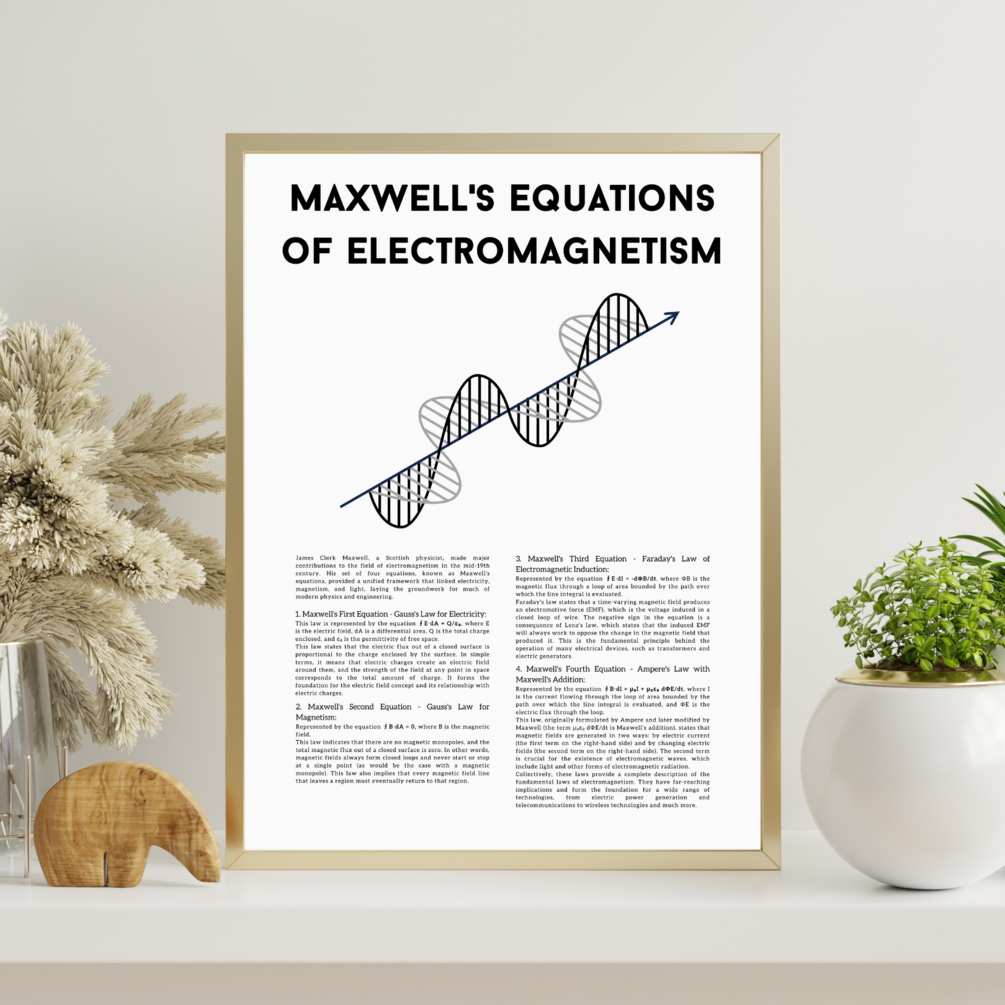 Brighten your surroundings with the symmetric beauty of our Maxwell's Equations Poster. This poster features all four of Maxwell's ground-breaking equations that harmoniously unite electricity, magnetism, and light. Available in sizes: 40x50, 50x70, and 42x59.4 cm, this poster is more than decor; it's a celebration of the scientific insights that power our modern world. Ideal for sparking conversations in living rooms, livening up office spaces, or inspiring budding scientists in classrooms.