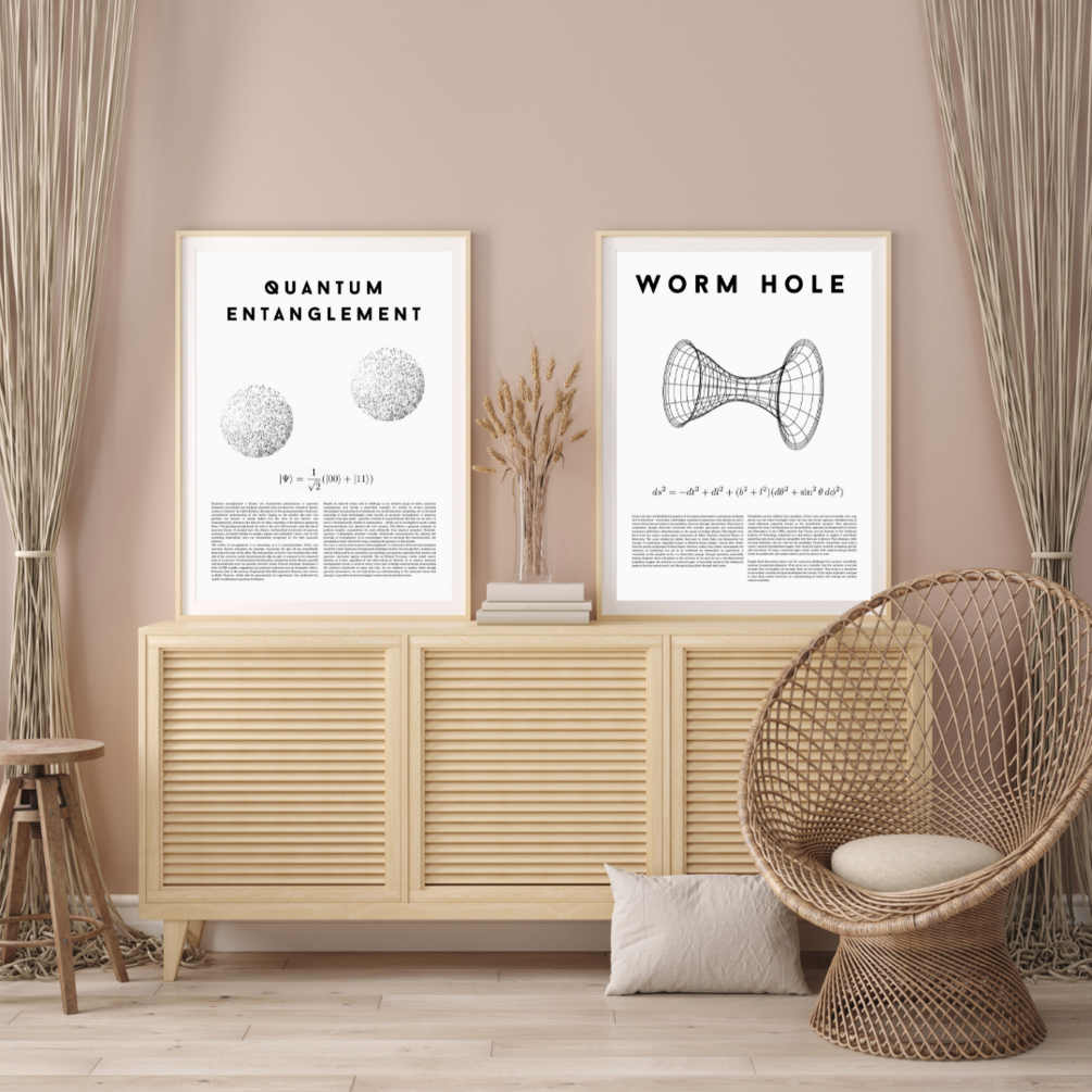 An enchanting collection of four physics-inspired printable wall art! These printables are designed to illustrate some of the most fascinating concepts in modern physics: black holes, wormholes, quantum entanglement, and dark matter.